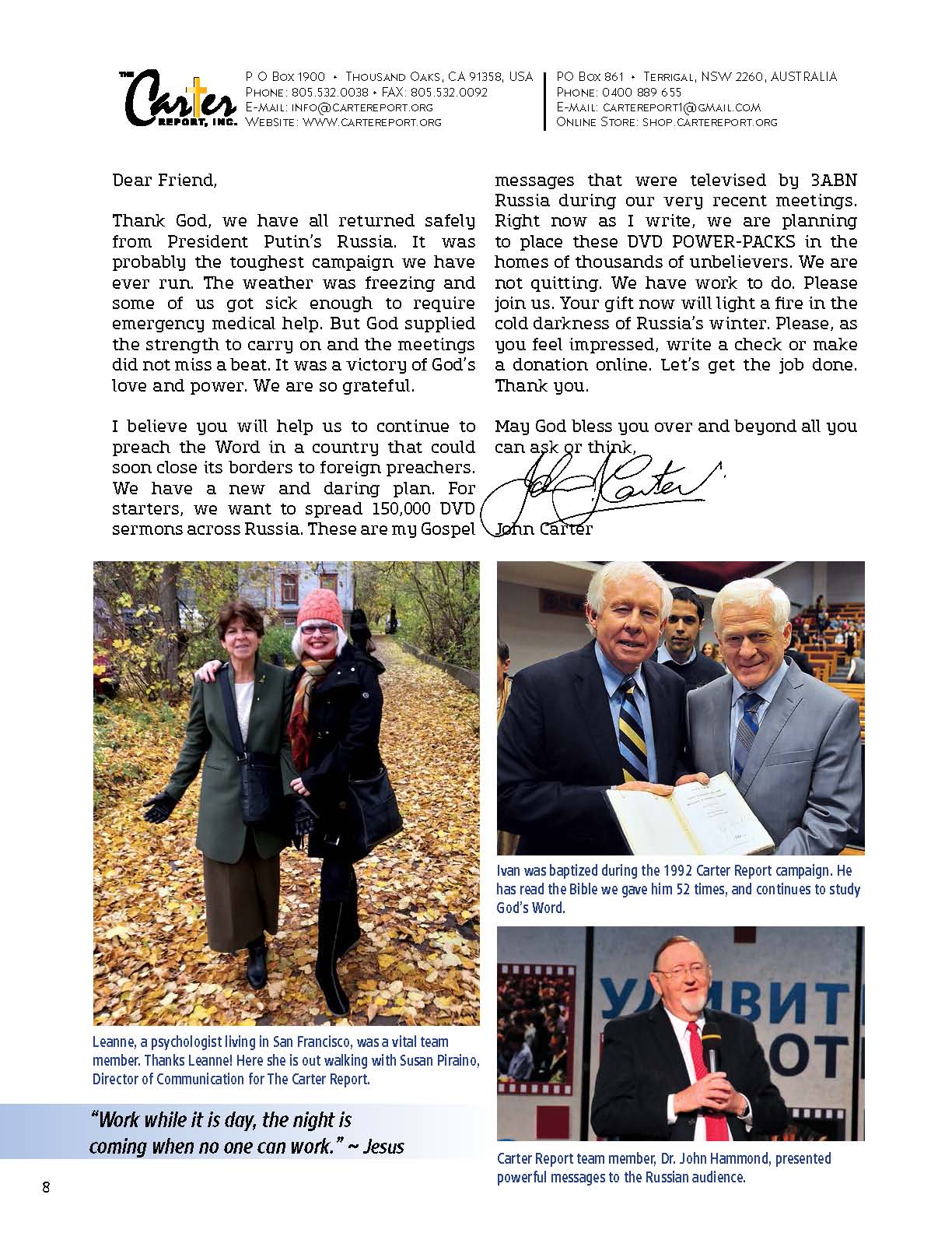 I would like to thank you for everything you’ve done for me and for the people in Nizhny Novgorod. It was really great to work with you and your team. Thanks to God for His grace and mercy. Thanks for the new people that got baptized at the program. I will be glad to work with you in future. Lev Bondarchuk, Youth Director West Russia Union Thank you very much for this update, dear Pastor John! We are working on some post-production for your wonderful DVD project, and have already purchased 10,000 DVDs. Once again, thank you for the blessings of your visit! God is with you! Once again, thank you very much, and one thousand times, for your program and your passion for saving souls for eternal salvation! Thank you for your love for the Russian people! God bless you, your beautiful family, and your amazing ministry! Your Russian sister and friend, Dr. Julia Outkina, Executive Director, Dear John, You have contributed so much to God’s work and you are quite simply unique. It is now so important that you pass on some of your learning, technique and skills in public evangelism. It is so tragic that the church fathers are moving away from public evangelism but what you have to offer is just too important to bypass. Not only have we lost the art of speaking in public but we have lost the technique of organizing a campaign, to say nothing of the art of evangelism from a TV studio. I admire you both so much. Beverley is a treasure who has stood by you and has a great perceptive and spiritual depth. Dr. John Hammond, Australia Dear Pastor Carter, This past Friday night I was watching 3ABN and saw your program from Russia and again on Sabbath. The very strong impression came to me to send this money for the work you are doing in Russia. I had this money for five years and had forgotten about it. Isn’t it amazing that the Lord impressed me to get it out of the safe and have it right at this time? What an awesome God we serve! I am praying for the meetings there in Russia, that the Lord will bring a mighty reaping. I am also praying for the safety of you and all who are helping you. Yours in Christ, J.D., Nebraska Dear Pastor Carter, I am sending you $75.00 in U.S. funds for your campaign in Russia in October. I believe in the great work you are doing to spread the Gospel to the world. Pastor John, I will be supporting your ministry for I believe in it. May God continue to bless you in your service for Him. God be with you, A.S., Canada |