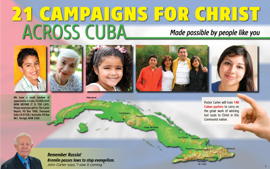 We have a small window of opportunity in Cuba. PLEASE GIVE NOW BEFORE IT IS TOO LATE. Please send your gift to: The Carter Report, PO Box 1900, Thousand Oaks CA 91358 / Australia: PO Box 861, Terrigal, NSW 2260.