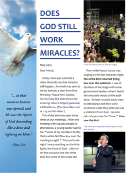 Today I have just watched a video that tells me that miracles still happen. An email was sent to me by Samuel, a man from Port Moresby, Papua New Guinea. Here is his YouTube link that shows the amazing video. (The dove flies over at 2:13 on this video.)