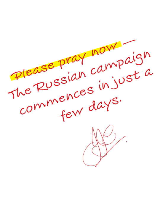The Russian door has creaked opened and we have been granted “Missionary” visas for one month. It is definitely getting more difficult to work in Russia. This could well be our Last Crusade. We first went there in 1991 as Communism was crumbling and hearts were hungry for God. Now we go to a new self-assertive nation that has rediscovered its pride and identity. Russia is back and on the march.