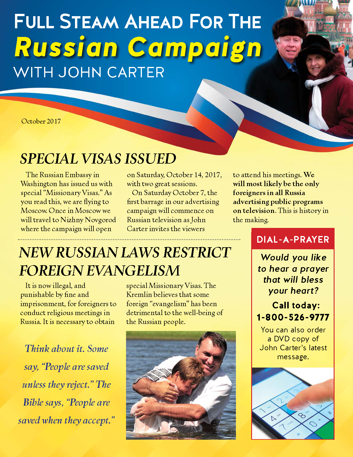 On Saturday October 7, the first barrage in our advertising campaign will commence on Russian television as John Carter invites the viewers to attend his meetings. We will most likely be the only foreigners in all Russia advertising public programs on television. This is history in the making.