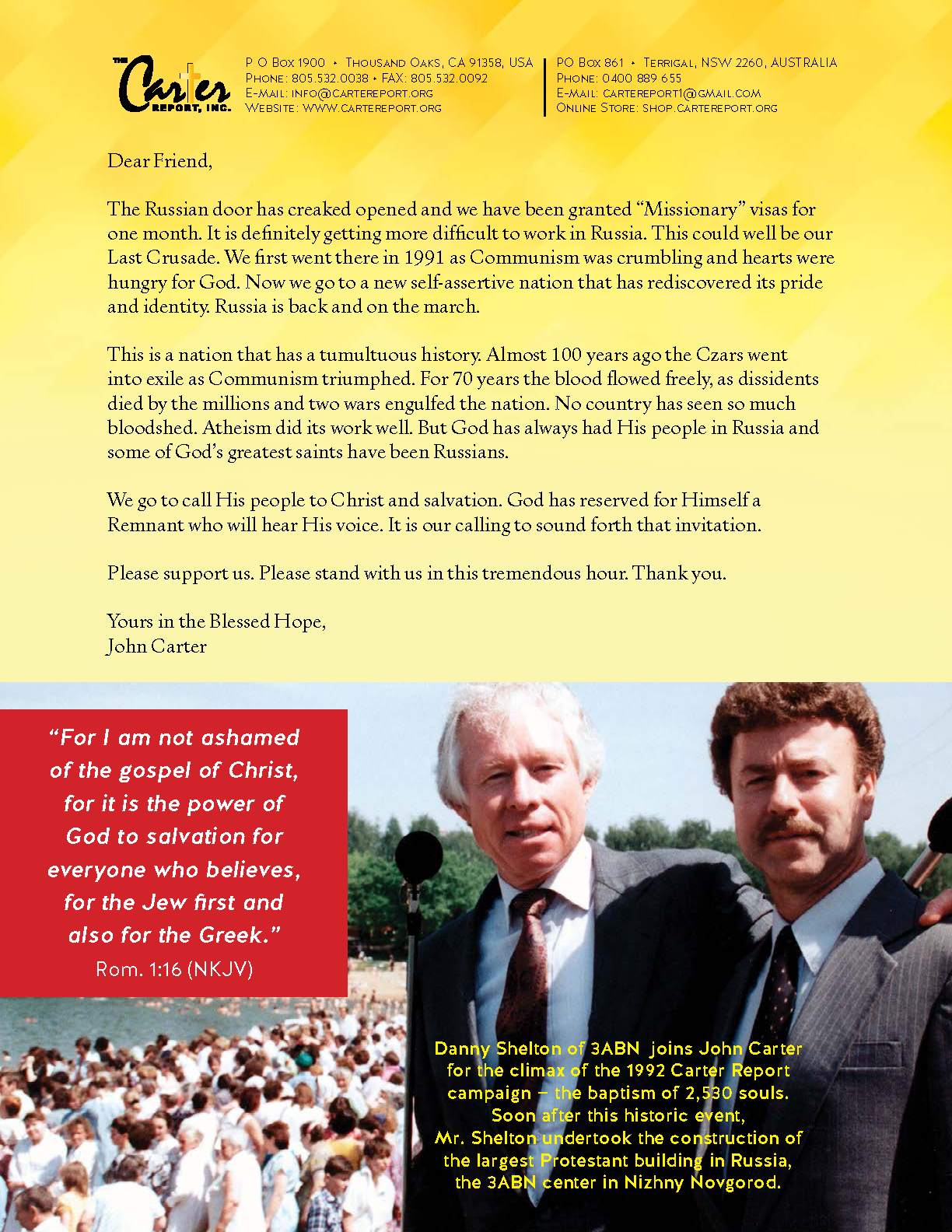 The Carter Report pioneered TV advertising in Russia, and were probably the first foreigners to advertise on Russian television. Back in 1991, John Carter was interviewed LIVE on Russian State TV across the eight time zones of the Soviet Union. Doors are now slamming shut in Russia and this indeed could be our LAST RUSSIAN CAMPAIGN. We were the first foreigners to run a full scale evangelistic campaign in Russia (1991) and we could well be the last ones.