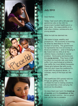 Today I had lunch with a 50-year-old gentleman who is the CEO for government funded healthcare in a large state. His responsibility is to look after children, adolescents and young people.