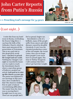 I write this from my hotel room in Russia, overlooking the frozen Volga River. I can hear the bells of the Orthodox Church, which in times past announced the persecution of Protestants. This is my 43rd visit to this desperately needy land. I am here to preach the Gospel and save souls. Nothing has changed. Last night we traveled for hours over icy roads to reach the Dzerzhinsk church where a marvelous group of believers awaited our arrival. God used us to raise up this church 24 years ago. The pastor was baptized in our meetings at that same time. How wonderful is that! The church is holding firm in spite of almost overwhelming difficulties. The music from the choir was so moving that it brought tears to my eyes. These are our people and I feel so proud, forgive me.