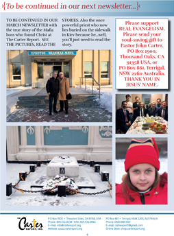 TO BE CONTINUED IN OUR MARCH NEWSLETTER with the true story of the Mafia boss who found Christ at The Carter Report. SEE THE PICTURES, READ THE STORIES. Also the once powerful priest who now lies buried on the sidewalk in Kiev because he…well, you’ll just need to read the story.