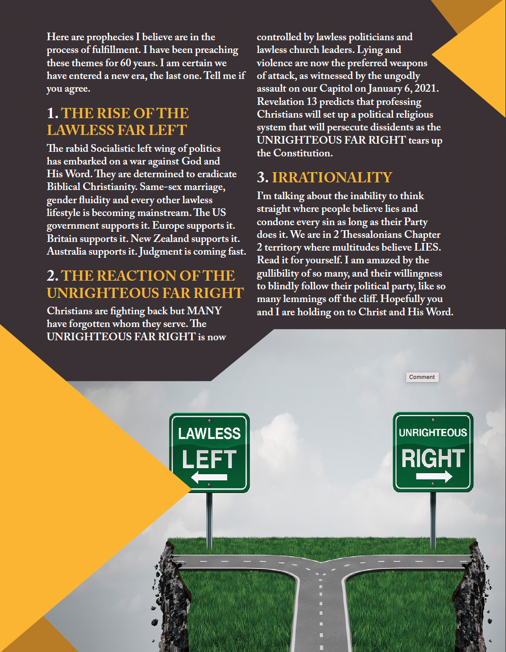 Jesus predicted pestilences. If you think Covid-19 is a hoax, try talking to a nurse or doctor from a Covid ICU ward. I have. Think also for a moment about the 45-year-old American politician who railed against masks and vaccines, and who died alone gasping for breath in the ICU. His last words were, “I wish I had gotten vaccinated.” It seems to me that many people are controlled by their gut emotions and not the facts. Many are influenced by professional liars. Covid-19 is just the start as we release deadly viruses from ravaged rain forests.