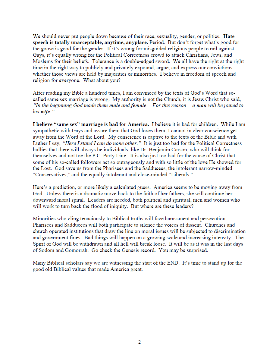I believe “same sex” marriage is bad for America. I believe it is bad for children. While I am sympathetic with Gays and assure them that God loves them, I cannot in clear conscience get away from the Word of the Lord. My conscience is captive to the texts of the Bible and with Luther I say, “Here I stand I can do none other.” It is just too bad for the Political Correctness bullies that there will always be individuals, like Dr. Benjamin Carson, who will think for themselves and not toe the P.C. Party Line. It is also just too bad for the cause of Christ that some of his so-called followers act so outrageously and with so little of the love He showed for the Lost. God save us from the Pharisees and the Sadducees, the intolerant narrow-minded “Conservatives,” and the equally intolerant and close-minded “Liberals.”