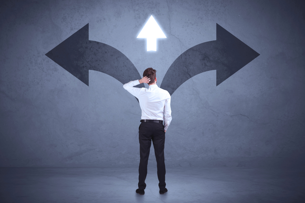 Businessman,Taking,A,Decision,While,Looking,At,Arrows,On,The