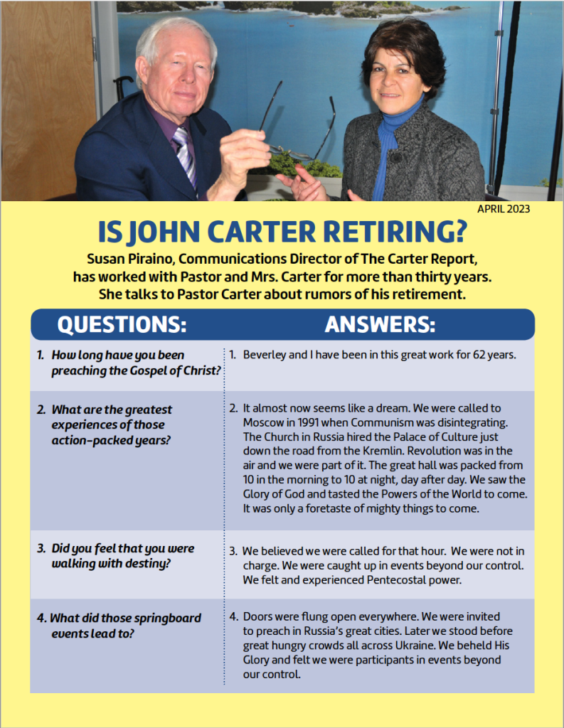 Susan Piraino talks to Pastor Carter about rumors of his retirement. Click here to download the PDF version of the newsletter. Click here for April 2023 Newsletter in Text format