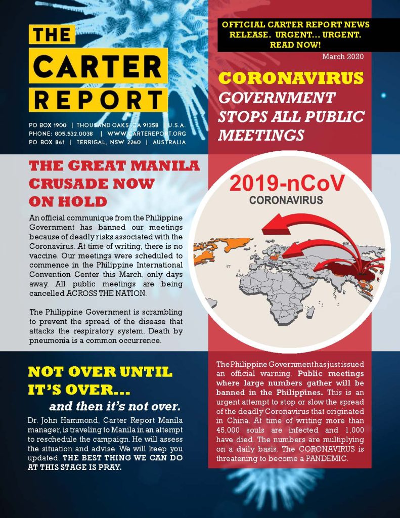 March 2020 OFFICIAL CARTER REPORT NEWS RELEASE. URGENT… URGENT.  READ NOW! CORONAVIRUS GOVERNMENT STOPS ALL PUBLIC MEETINGS The Philippine Government has just issued an official warning. Public meetings where large numbers gather will be banned in the Philippines. This is an urgent attempt to stop or slow the spread of the deadly Coronavirus that originated […]