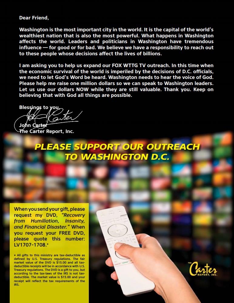 I am asking you to help us expand our FOX WTTG TV outreach. In this time when the economic survival of the world is imperiled by the decisions of D.C. officials, we need to let God’s Word be heard. Washington needs to hear the voice of God. Please help me raise one million dollars so we can speak to Washington leaders. Let us use our dollars NOW while they are still valuable. Thank you. Keep on believing that with God all things are possible.