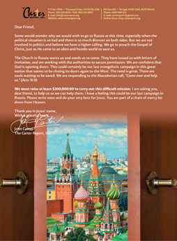 The Church in Russia wants us and needs us to come. They have issued us with letters of invitation, and are working with the authorities to secure permission. We are confident that God is opening doors. This could certainly be our last evangelistic campaign in this great nation that seems to be closing its doors again to the West. The need is great. There are souls waiting to be saved. We are responding to the Macedonian call, “Come over and help us.” (Acts 16:9)